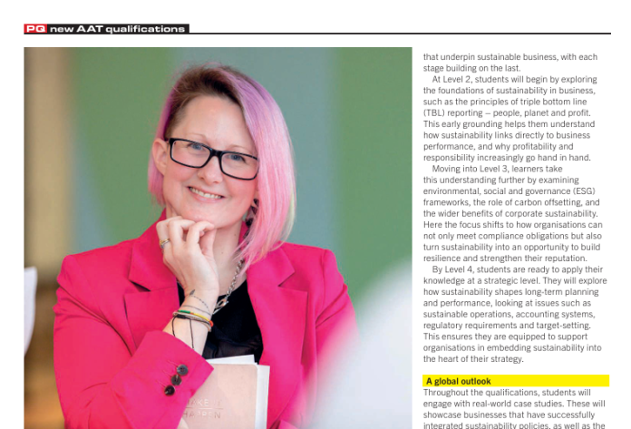 AAT is embedding sustainability throughout its new qualification, preparing the next generation of finance professionals to lead in this space, says AAT’s Clare Dye (pictured).